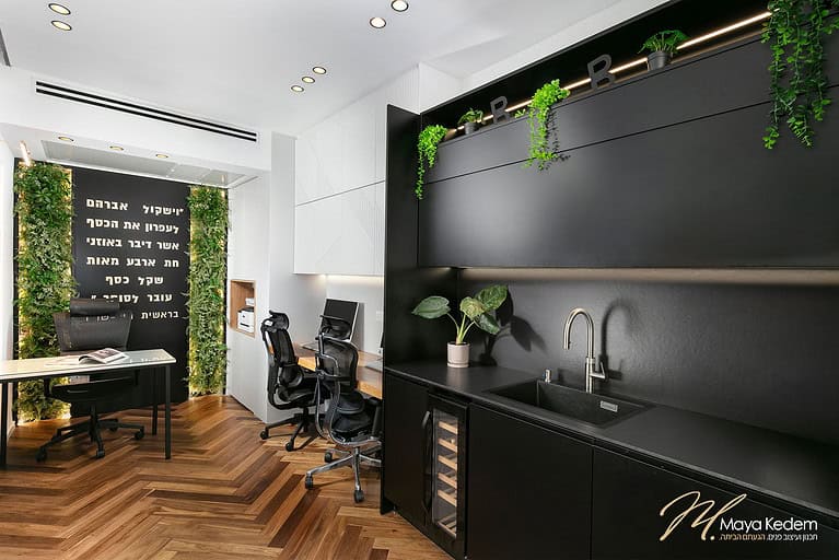 המטבחון תוכנן כמו תכשיט – רהיט יוקרתי שמשלב פונקציונליות עם עיצוב מרהיב. הוא כולל פתרונות אחסון חכמים, ארון כיור, משטח שיש שחור יוקרתי וברז מתקדם המספק מים חמים, קרים וסודה בלחיצת כפתור. לצד זאת, שולבו מקרר יין ומקרר משרדי אינטגרלי להשלמת הנוחות. תאורה נסתרת מתחת לקלפות האחסון מאירה בעדינות את משטח העבודה, מוסיפה פרקטיות ומדגישה את תחושת היוקרה.